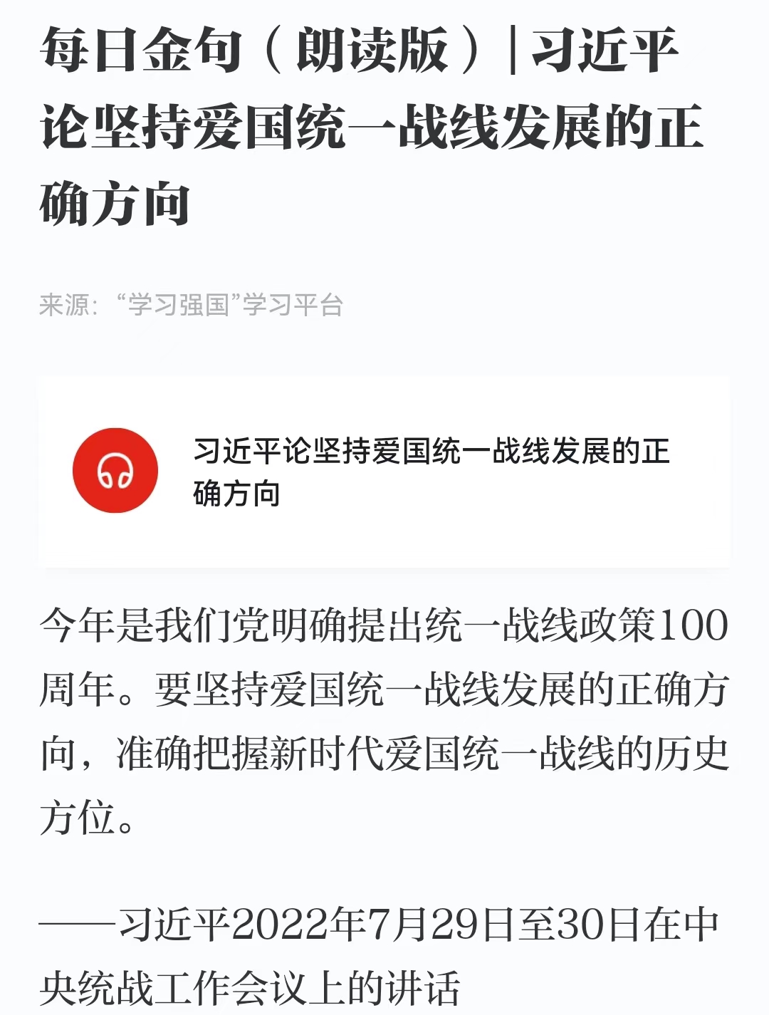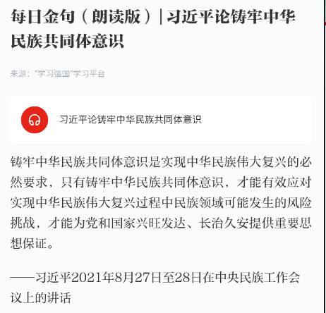 每日金句( 朗讀版)|習近平論鑄牢中華民族共同體意識? ? 鑄牢中華民族共同體意識是實現中華民族偉大復興的必然要求,只有鑄牢中華民族共同體意識,才能有效應對實現中華民族偉大復興過程中民族領域可能發(fā)生的風險挑戰(zhàn),才能為黨和國家興旺發(fā)達、長治久安提供重要思想保證。? ? ... 2022-08-31