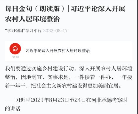 習近平論深入開展 農村人居環(huán)境整治? ? 我們要通過實施鄉(xiāng)村建設行動,深人開展農村人居環(huán)境整治,因地制宜、實事求是,- -件接著- -件辦,一年接著一年干,把社會主義新農村建設得更加美麗宜居。? ? 習近平2021年8月23日至24日在河北承德考察時的講話 2022-08-17