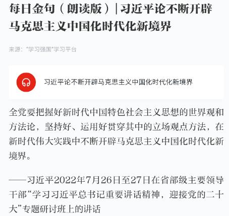每日金句|習近平論不斷開辟馬克思主義中國化時代化新境界? ? 全黨要把握好新時代中國特色社會主義思想的世界觀和方法論,堅持好、運用好貫穿其中的立場觀點方法,在新時代偉大實踐中不斷開辟馬克思主義中國化時代化新境界。? ? ——習近平2022年7月26日至27日在省部級主要領導干部... 2022-08-15