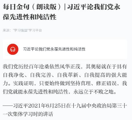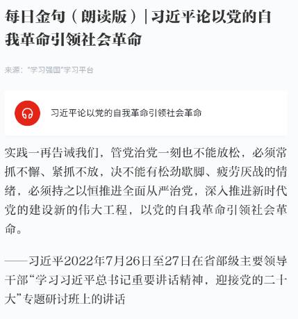 每日金句(朗讀版) |習近平論我們黨永葆先進性和純潔性? ? 我們黨歷經百年滄桑依然風華正茂,其奧秘就在于具有自我凈化、自我完善、自我革新、自我提高的強大能自我凈化、自我完善、自我革新、自我提高的強大能自我凈化、自我完善、自我革新、自我提高的強大能力。實踐證明,只要始... 2022-08-18