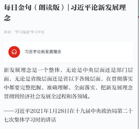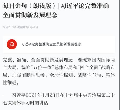每日金旬( 朗讀版)|習近平論新發(fā)展理 念? ? 新發(fā)展理念是一個整體,無論是中央層面還是部門層面,無論是省級層面還是省以下各級層面,在貫徹落實中都要完整把握、準確理解、全面落實,把新發(fā)展理念貫徹到經濟社會發(fā)展全過程和各領域。? ? ?——習近平2021年1月28日... 2022-08-19