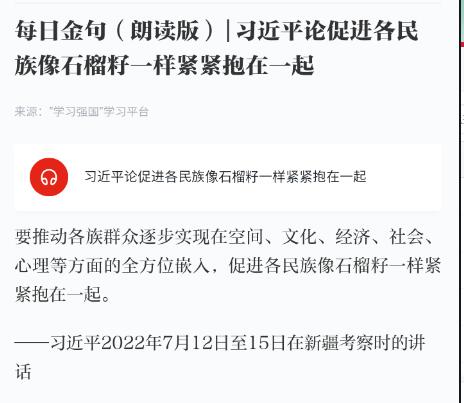 習近平 論促進各民族像石榴籽-樣緊緊抱在一起? ? ?習近平論促進各民族像石榴籽一樣緊緊抱在一起要推動各族群眾逐步實現在空間、文化、經濟、社會、心理等方面的全方位嵌入,促進各民族像石榴籽-樣緊緊抱在一起。? ? 一-習近平2022年7月12日至15日在新疆考察時的講話 2022-08-22