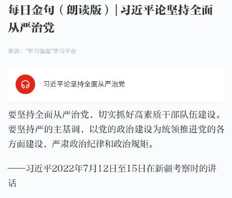 習近平論堅持全面從嚴治黨? ?要堅持全面從嚴治黨,切實抓好高素質干部隊伍建設。要堅持嚴的主基調,以黨的政治建設為統(tǒng)領推進黨的各方面建設,嚴肅政治紀律和政治規(guī)矩。? ? ——習近平2022年7月12日至15日在新疆考察時的講話 2022-08-24