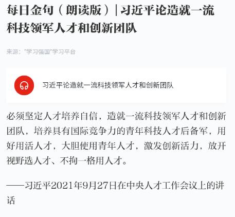 每日金句(朗讀版) | 習近平論造就一流科技領軍人才和創(chuàng)新團隊? ? 習近平論造就-流科技領軍 人才和創(chuàng)新團隊必須堅定人才培養(yǎng)自信,造就一流科技領軍人才和創(chuàng)新團隊,培養(yǎng)具有國際競爭力的青年科技人才后備軍,用好用活人才,大膽使用青年人才,激發(fā)創(chuàng)新活力,放開視野選人才、不拘-格用人... 2022-08-27