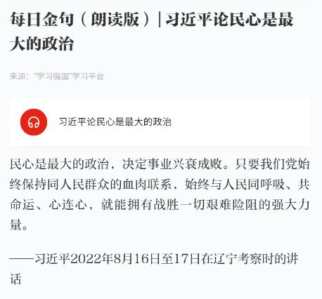 每日金句( 朗讀版)|習近平論民心是最大的政治? ?民心是最大的政治,決定事業(yè)興衰成敗。只要我們黨始終保持同人民群眾的血肉聯系,始終與人民同呼吸、共命運、心連心,就能擁有戰(zhàn)勝一切艱難險阻的強大力量。? ? ——習近平2022年8月16日至17日在遼寧考察時的講話 2022-08-29
