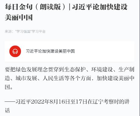 每日金句( 朗讀版)|習近 平論加快建設美麗中國? ?要把綠色發(fā)展理念貫穿到生態(tài)保護、環(huán)境建設、生產制造、城市發(fā)展、人民生活等各個方面,加快建設美麗中國。? ? ——習近平2022年8月16日至17日在遼寧考察時的講話 2022-08-30