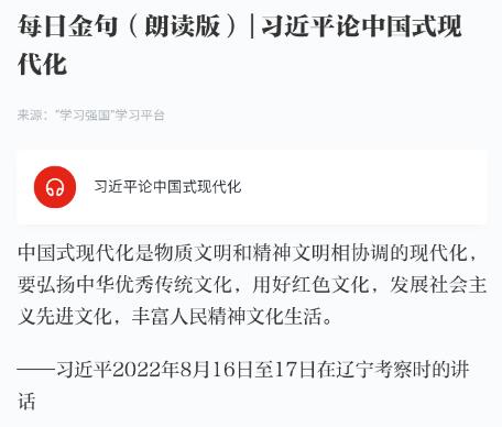 每日金旬(朗讀版)|習近平論中國式現代化? ? 中國式現代化是物質文明和精神文明相協調的現代化,要弘揚中華優(yōu)秀傳統(tǒng)文化,用好紅色文化,發(fā)展社會主義先進文化,豐富人民精神文化生活。? ? ——習近平2022年8月16日至17日在遼寧考察時的講話 2022-09-02